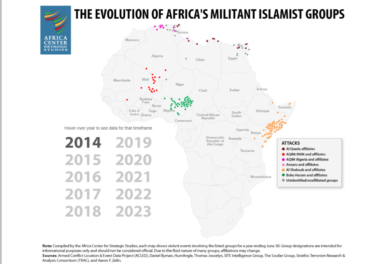 A year-on-year mid-year review of violence involving African militant Islamist groups assessing trends over the past decade underscores the surge in fatalities in the Sahel and Somalia. Key findings include: