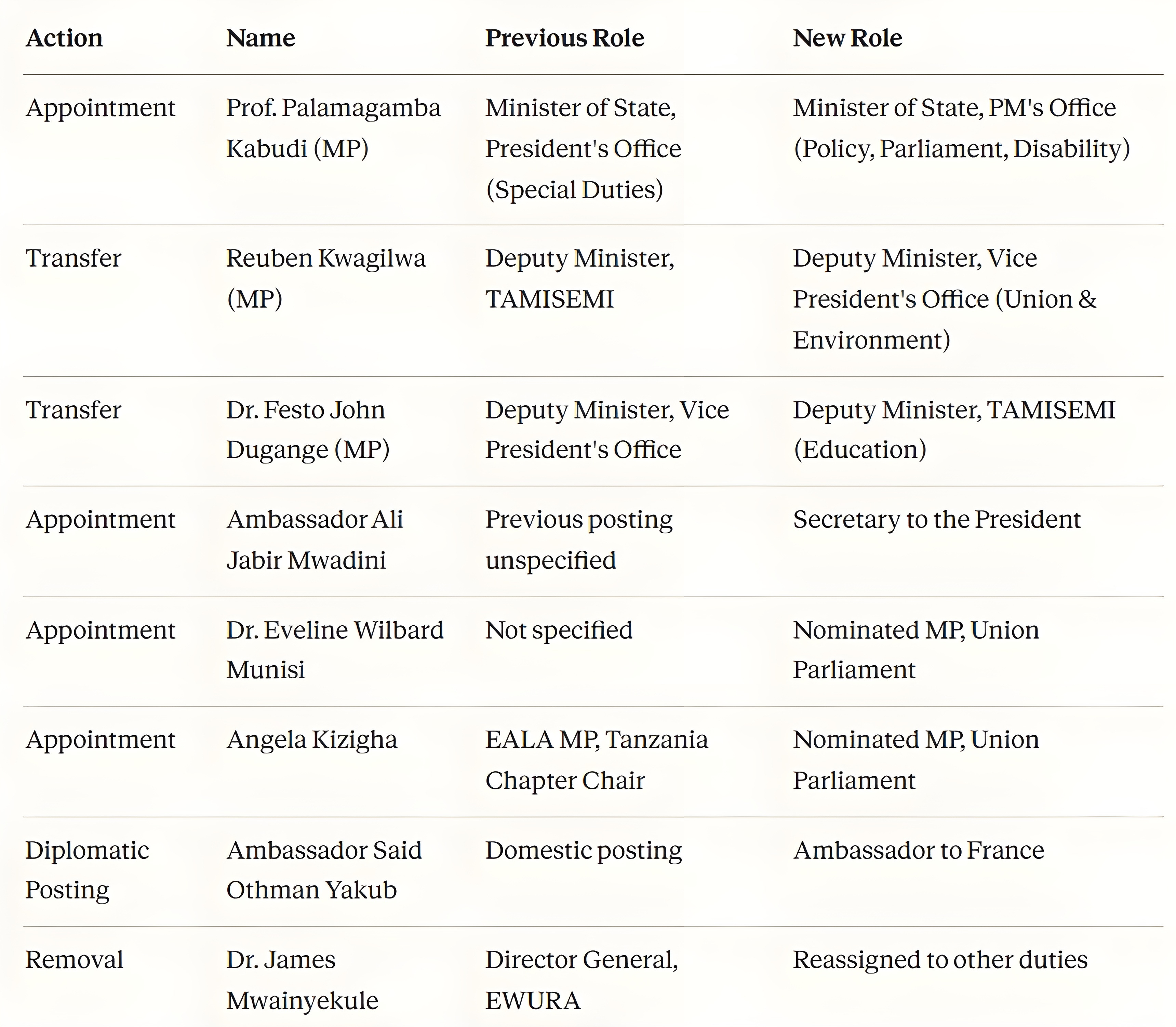 The communiqué was produced during one of the President’s visits to Zanzibar, adding a dimension consistent with State House’s established pattern of releasing sensitive personnel decisions from Zanzibar, where domestic media coverage is thinner and opposition-aligned civil society less concentrated than in Dar es Salaam. The same document covers seven other personnel actions, including the appointment of Prof. Palamagamba Kabudi as Minister of State in the Prime Minister’s Office, the posting of Ambassador Said Othman Yakub to France, and the removal of Dr. James Andilile Mwainyekule as Director General of the Energy and Water Utilities Regulatory Authority (EWURA).
