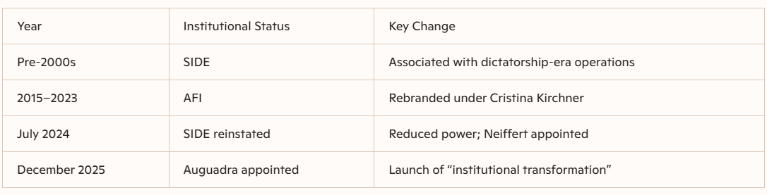 SIDE was reinstated as a secretariat in July 2024 after operating for years as the Federal Intelligence Agency (AFI). The reinstatement restored SIDE’s historical name and structure, though its legacy remains controversial due to its association with dictatorship‑era abuses.
