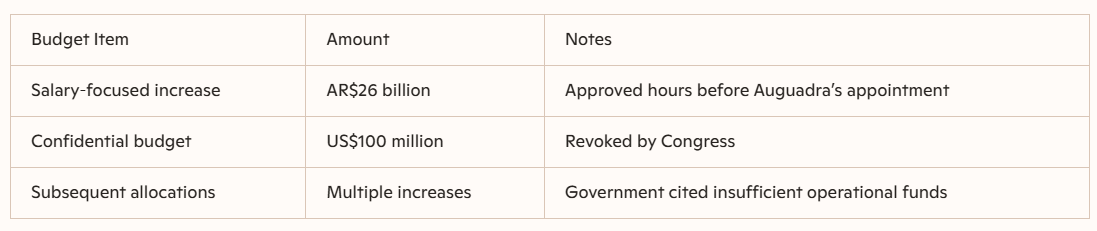Auguadra’s appointment coincided with a significant budget increase: AR$26 billion (approx. US$17 million), primarily allocated to salaries. SIDE had previously been granted a US$100 million confidential budget, later revoked by Congress, prompting repeated requests for additional funding.