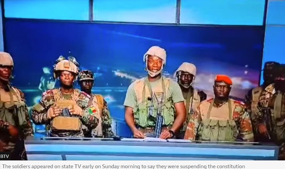 Early Morning Hours: A group of at least eight soldiers, led by Lieutenant Colonel Pascal Tigri, seized control of Benin’s national television headquarters. The mutineers broadcast a statement dissolving all state institutions, suspending political activities, closing borders, and announcing Tigri as president of their newly-formed junta.
