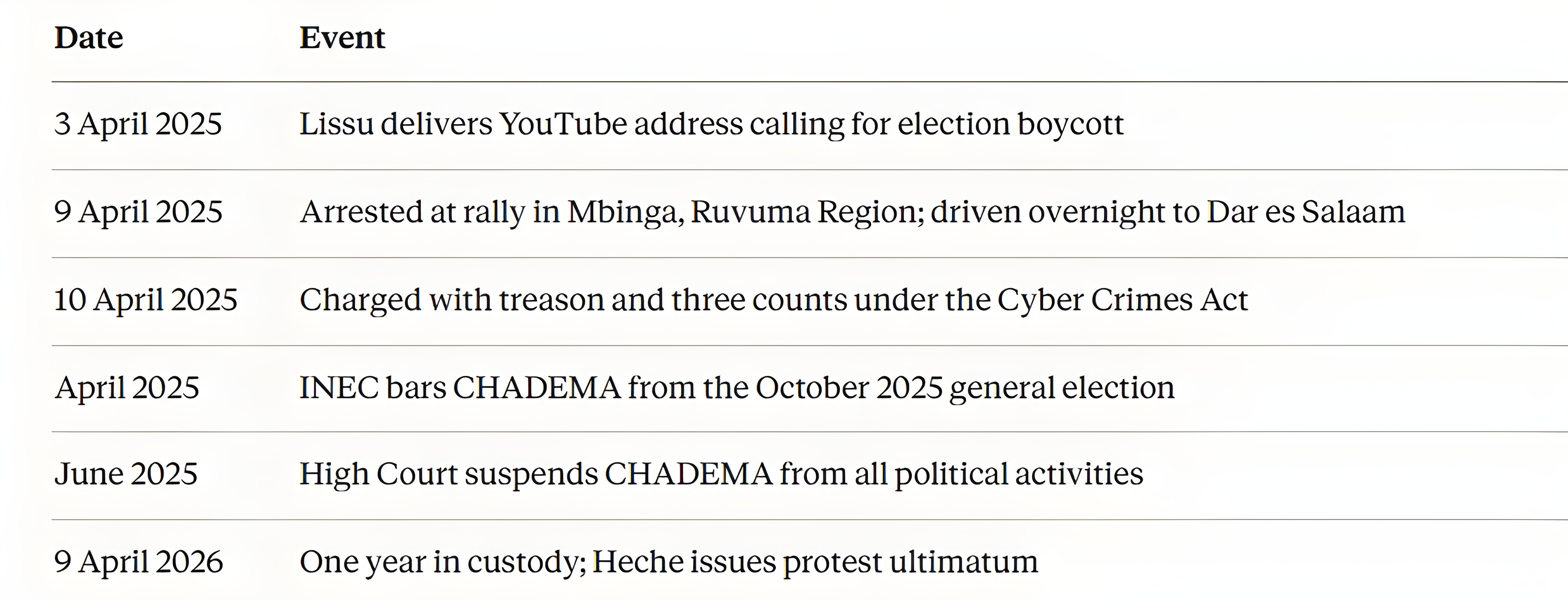 Lissu was arrested on the evening of 9 April 2025 following a rally in Mbinga, Ruvuma Region, and transferred overnight — more than 1,000 kilometres — to Dar es Salaam, where he was charged the following day with treason and three counts of publishing false information under the Cyber Crimes Act. The treason charge carries a mandatory death sentence upon conviction.