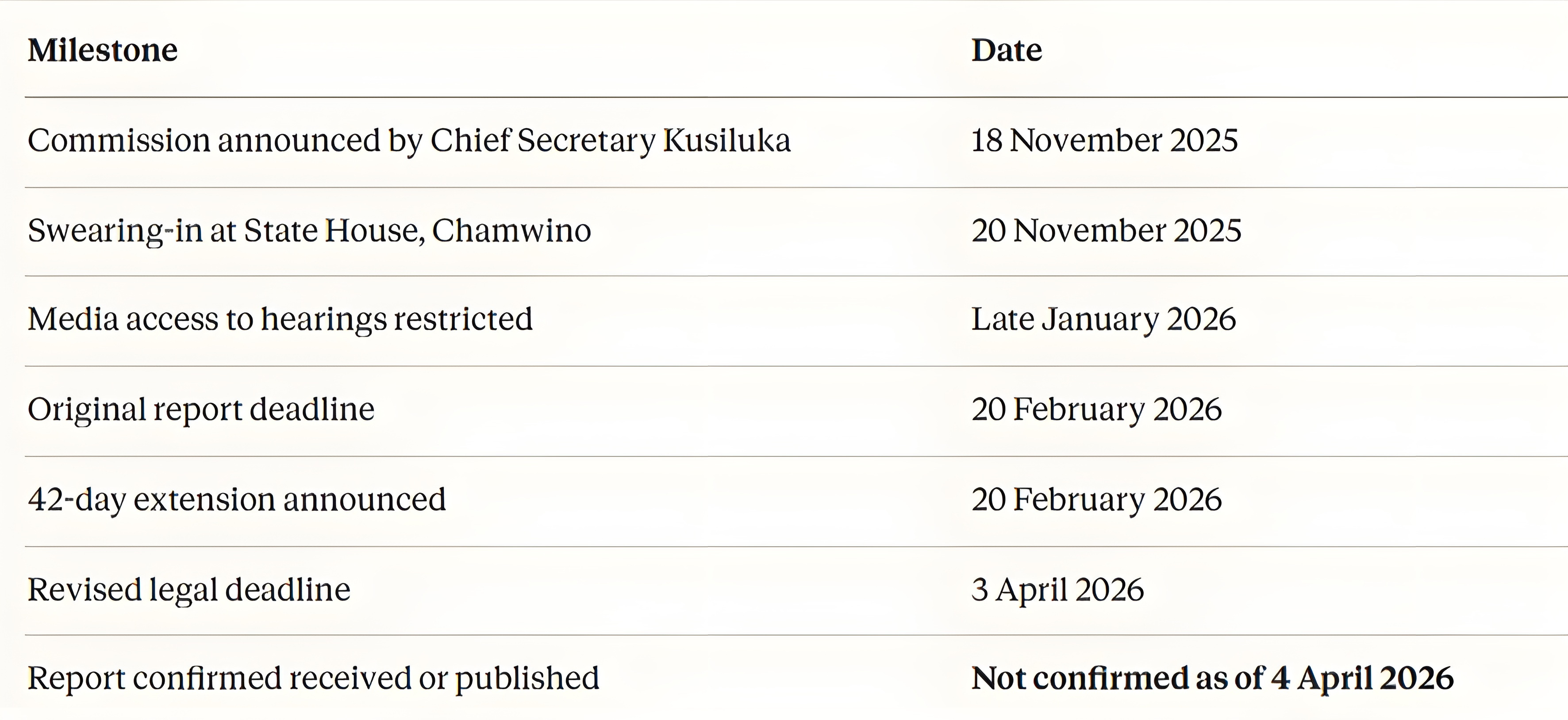 A government notice announced the extension on 20 February 2026, pushing the final deadline to 3 April 2026. The reasons cited included the high volume of testimony received, the need for more thorough investigation, and the requirement to deploy expert analysis on some of the evidence gathered.
