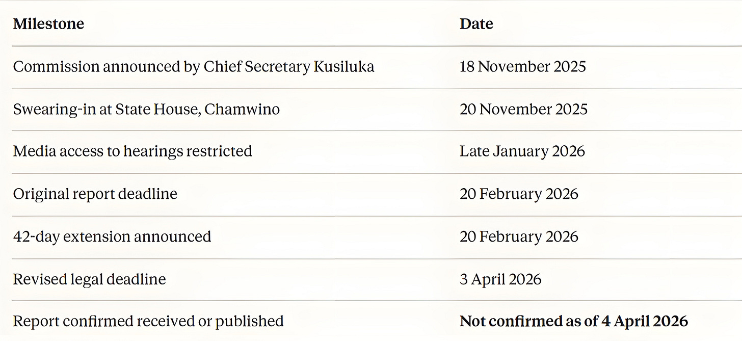 The Chande Commission — formally the Commission of Inquiry into Violence Surrounding Tanzania’s 29 October 2025 General Election — was legally required to submit its findings to President Samia Suluhu Hassan by 3 April 2026, following a 42-day extension from its original 20 February deadline. As of 4 April 2026, no report has been publicly released, no State House communiqué has confirmed receipt, and no timetable for publication has been announced. The commission’s silence, on the eve of Easter weekend, is not administrative — it is political.