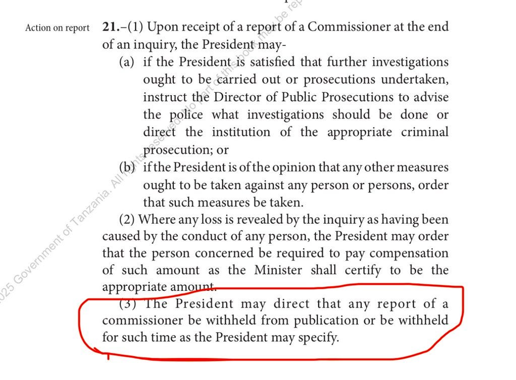 Section 21(3) of Tanzania’s Commissions of Inquiry Act Gives President Samia Unilateral Power to Suppress the Report Indefinitely