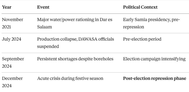 The December 2025 Dar es Salaam water crisis affecting six million residents results primarily from structural infrastructure failures (37% distribution losses, 270 million litre production shortfall) compounded by climate shocks (failed October-December rains), not deliberate political punishment. However, the crisis disproportionately impacts opposition strongholds during post-election repression, raising legitimate questions about regime prioritisation versus capacity in Tanzania’s largest city.