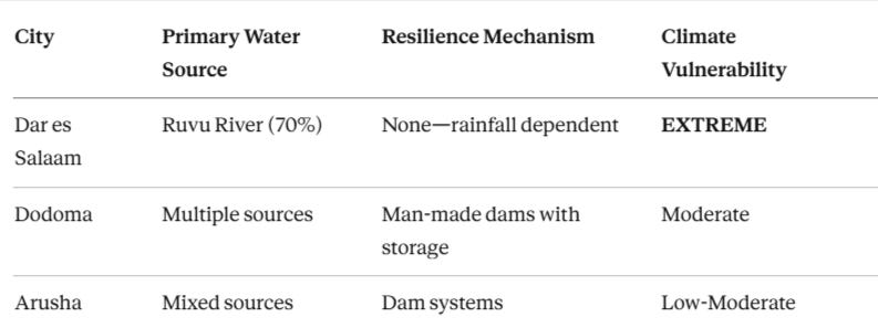 Critical Design Gap: Despite coastal location, Dar es Salaam has zero desalination capacity, leaving the city entirely dependent on inland rainfall patterns affecting the Ruvu River.