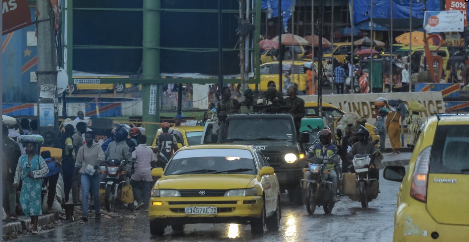 Armed Forces of the Democratic Republic of the Congo (FARDC) soldiers are seen sitting on top of a truck driving in the streets of Bukavu on Feb. 14, 2025.