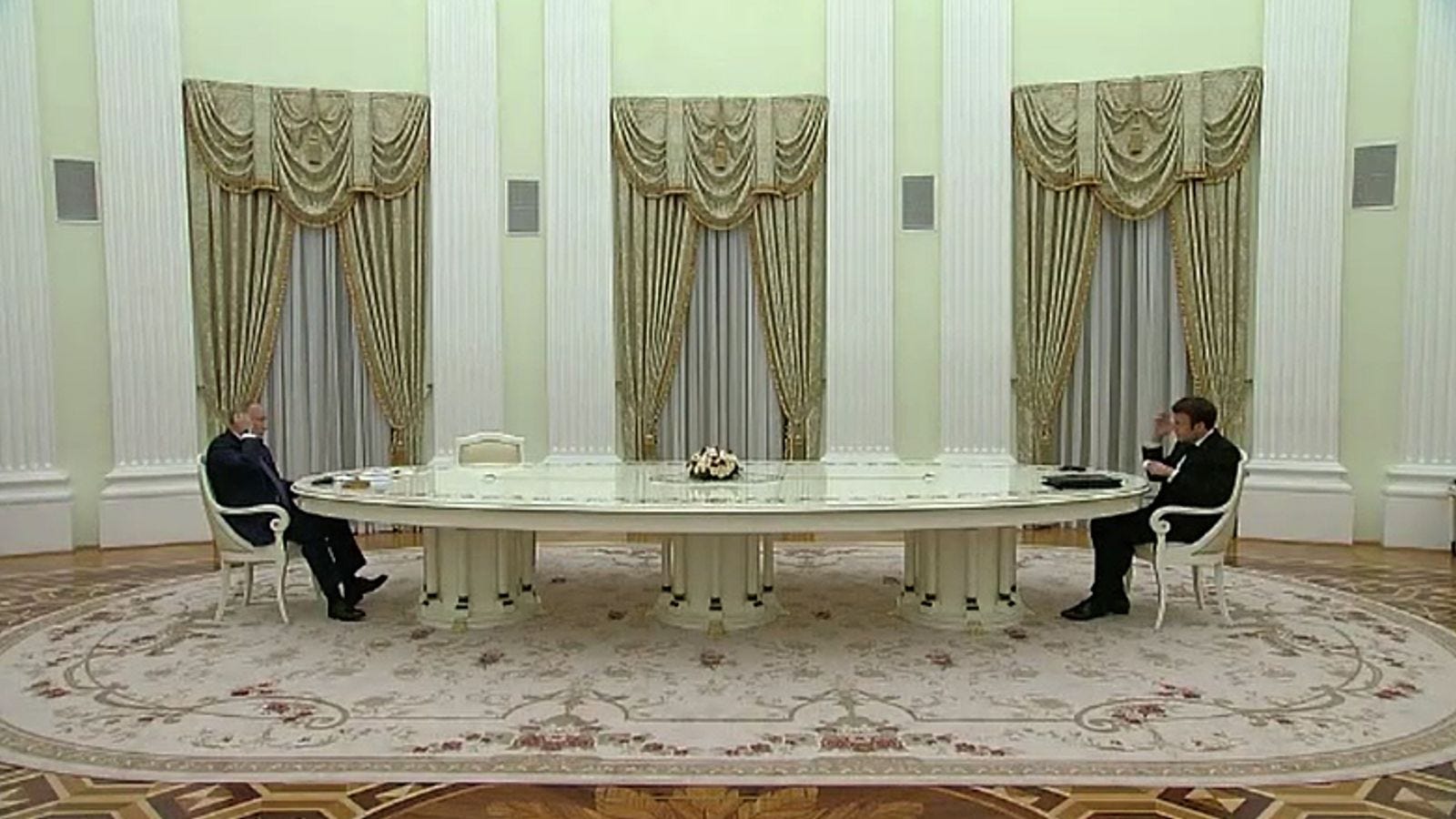 The Kremlin says it was not a problem that Emmanuel Macron refused a test from their doctors, but it meant he had to stay six metres away from President Putin.