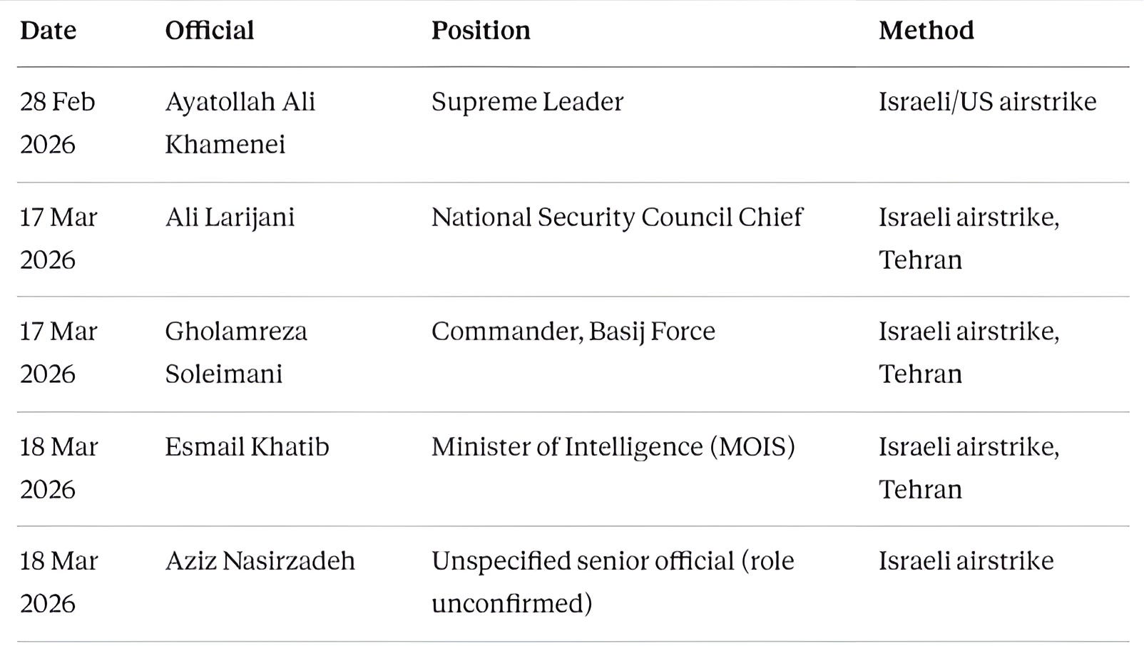📊 Timeline: Senior Iranian Officials Killed Since 28 February 2026