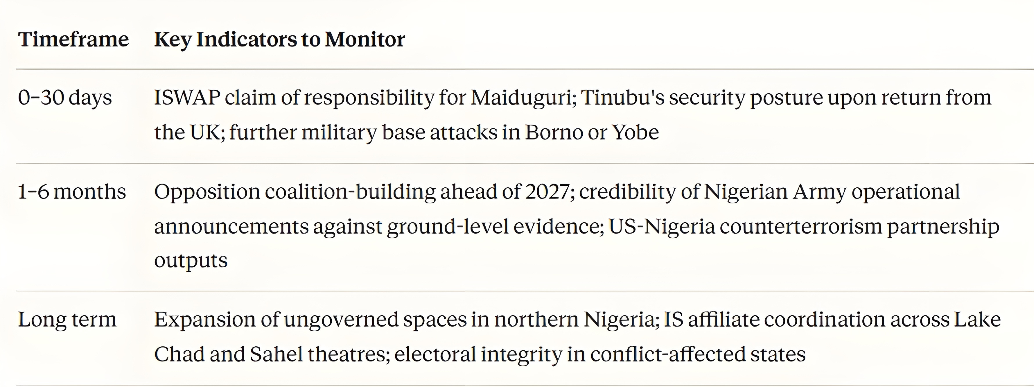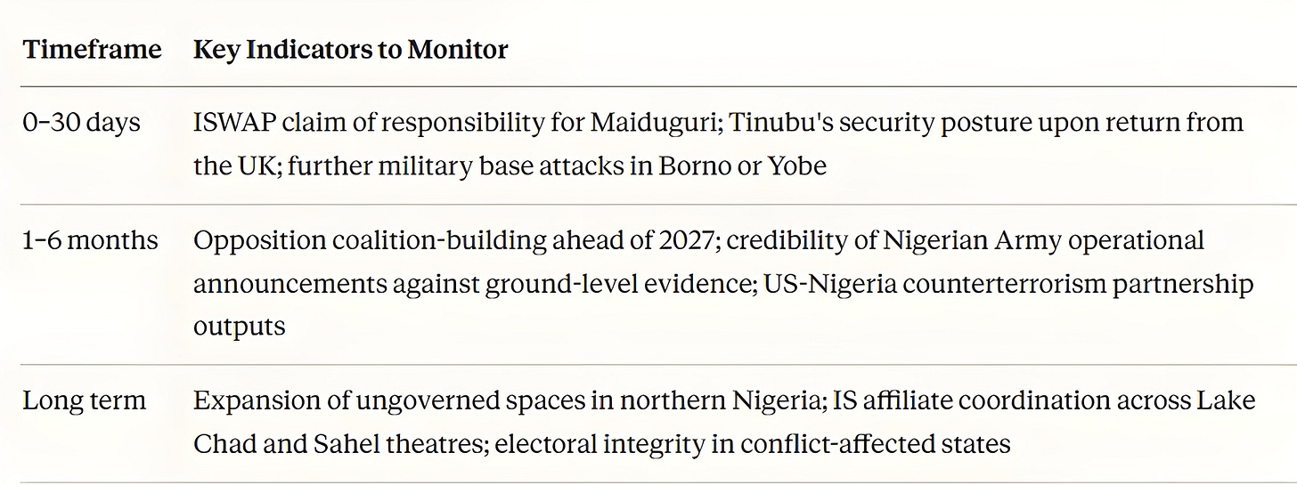 The more plausible scenario is a presidency that survives to 2027 in a weakened condition, with security as the primary line of attack available to opposition candidates, and with a northeast that has slipped further from effective government control than at any point since the mid-2010s.