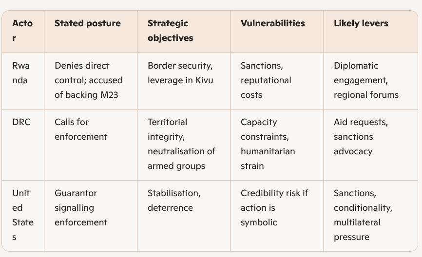 Actor Stated posture Strategic objectives Vulnerabilities Likely levers Rwanda Denies direct control; accused of backing M23 Border security, leverage in Kivu Sanctions, reputational costs Diplomatic engagement, regional forums DRC Calls for enforcement Territorial integrity, neutralisation of armed groups Capacity constraints, humanitarian strain Aid requests, sanctions advocacy United States Guarantor signalling enforcement Stabilisation, deterrence Credibility risk if action is symbolic Sanctions, conditionality, multilateral pressure