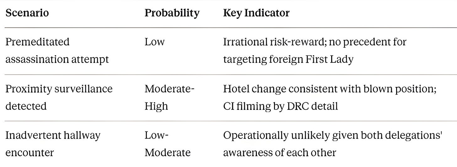 This record confirms Kigali’s institutional capability for extraterritorial operations. However, targeting the sitting First Lady of a neighbouring state during a US-hosted summit would be an entirely different operational category. Three weeks after Washington sanctioned the Rwandan military, the risk-reward calculus of such an attempt on American soil would be irrational.