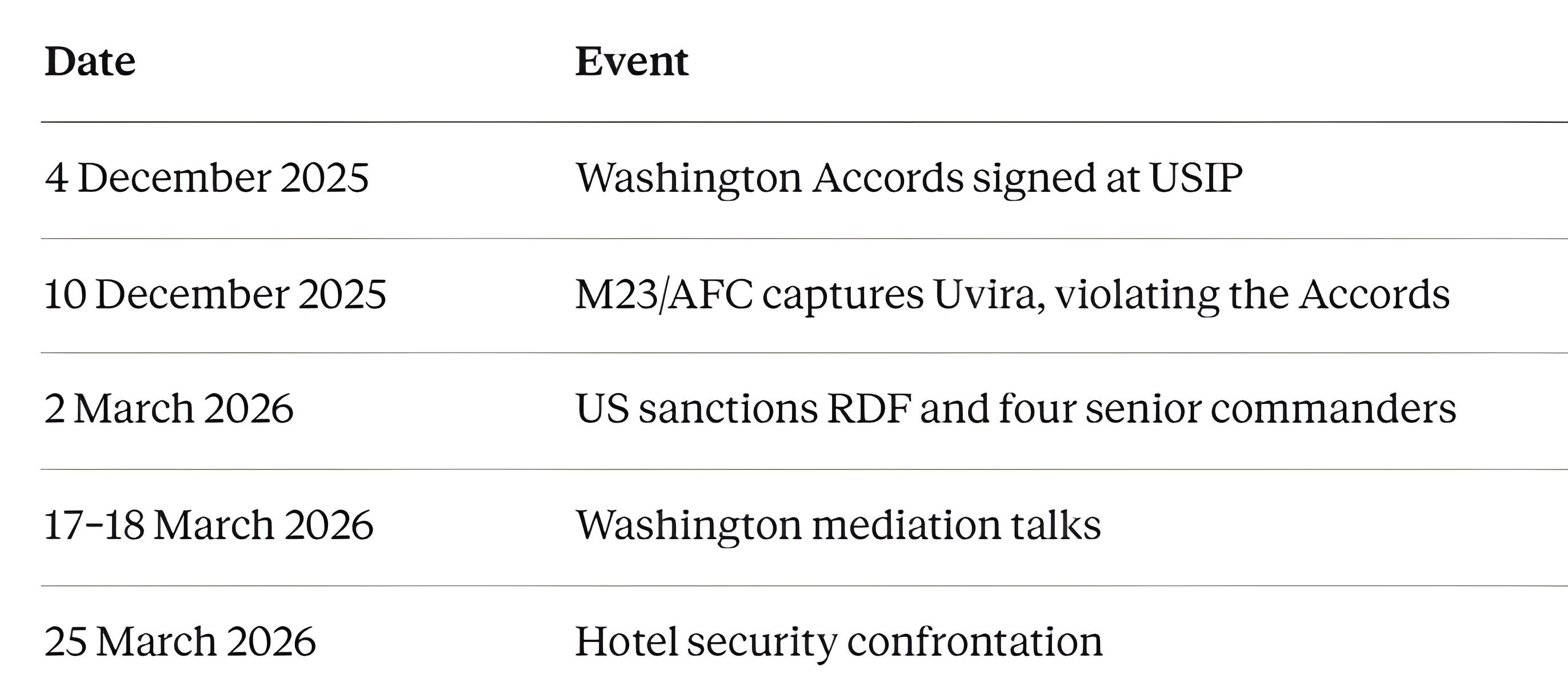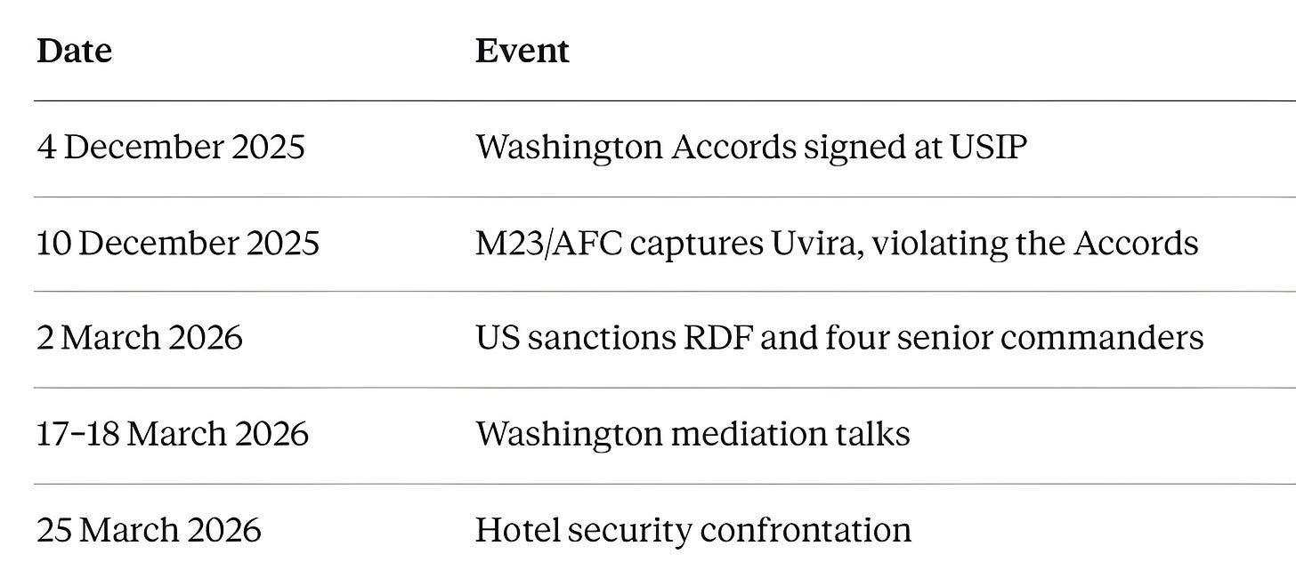On 2 March 2026, the US Treasury Department’s Office of Foreign Assets Control sanctioned the Rwanda Defence Force and four senior commanders — Maj. Gen. Vincent Nyakarundi, Maj. Gen. Ruki Karusisi, Gen. Mubarakh Muganga, and Brig. Gen. Stanislas Gashugi — for actively supporting, training, and fighting alongside M23. Mediation talks on 17–18 March produced what US officials called concrete de-escalation steps. One week later, the hotel confrontation erupted on the same American soil where the Accords were signed.