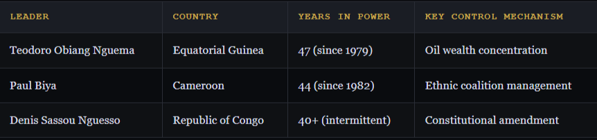Within Central and West Africa, Sassou Nguesso’s 40-year rule exemplifies a pattern of personalised autocracy sustained through constitutional manipulation and resource capture. Equatorial Guinea’s Teodoro Obiang Nguema has governed since 1979, whilst Cameroon’s Paul Biya has held office since 1982. These three leaders share common strategies: removal of term limits, control of electoral institutions, and systematic suppression of opposition movements.