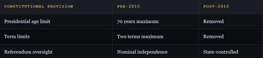 Constitutional reforms enacted during Sassou Nguesso’s second tenure removed constraints on presidential age and term limits. These amendments, passed through referenda controlled by the ruling party, legalised indefinite executive tenure and eliminated mechanisms for democratic alternation. The 2016 constitutional changes specifically enabled Sassou Nguesso, then 72, to seek re-election beyond previously mandated age thresholds.