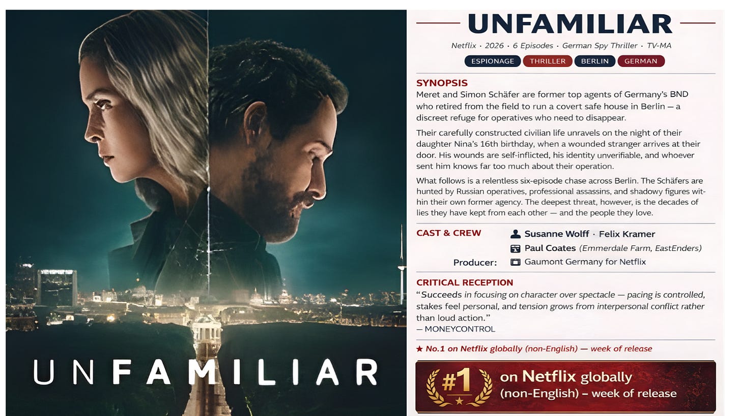 Unfamiliar is a six-episode German-language espionage thriller in which former BND agents Meret and Simon Schäfer, now running a covert safe house in Berlin, are dragged back into operational life when a wounded stranger arrives at their door on their daughter’s 16th birthday. The threat behind him — a high-ranking GRU officer named Josef Koleev, connected to a blown mission in Belarus sixteen years earlier — sets off a chain of events that is less about action than about what sustained deception does to identity, marriage, and trust.