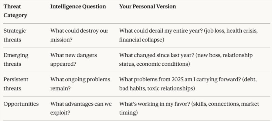 2026 Action: Write your personal threat assessment by January 15. Intelligence agencies can’t plan missions without understanding the environment—neither can you.