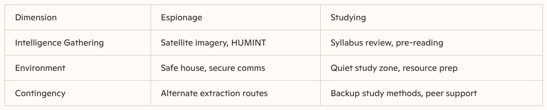 Studying as an intelligence operation transforms learning into a disciplined mission. By applying espionage principles—objectives, reconnaissance, cover identity, tools, alliances, adaptability, security, and debriefing—students and professionals can achieve mastery with precision and resilience.