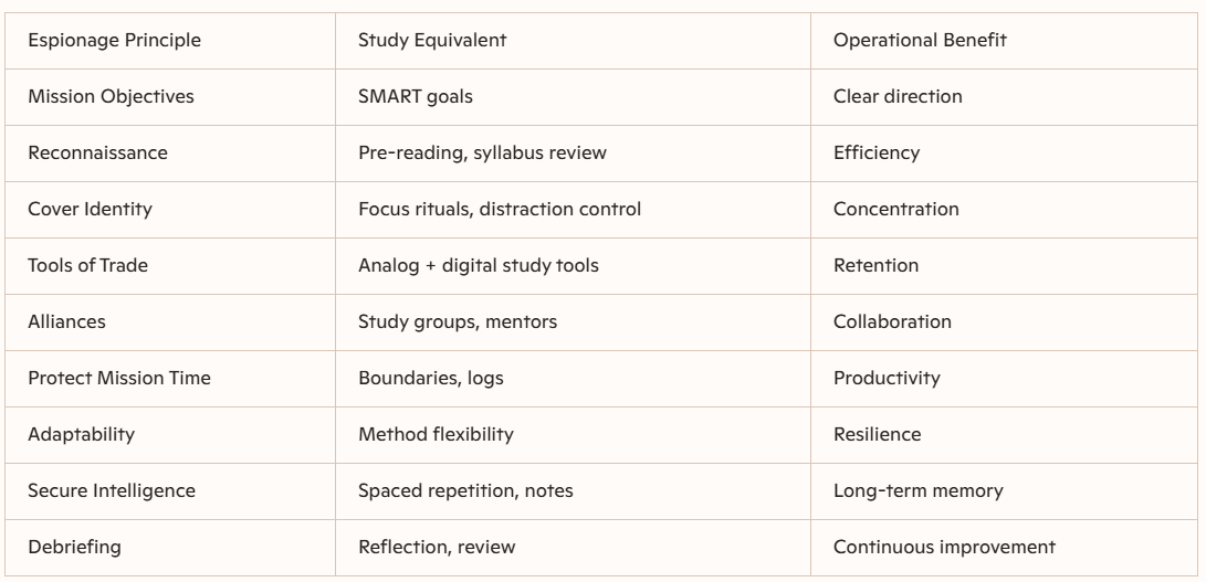 Every great spy begins as a rookie; mastery comes from preparation, adaptability, and perseverance. By treating study sessions as covert operations, learners can achieve academic and professional success with the same rigour that intelligence agencies demand.