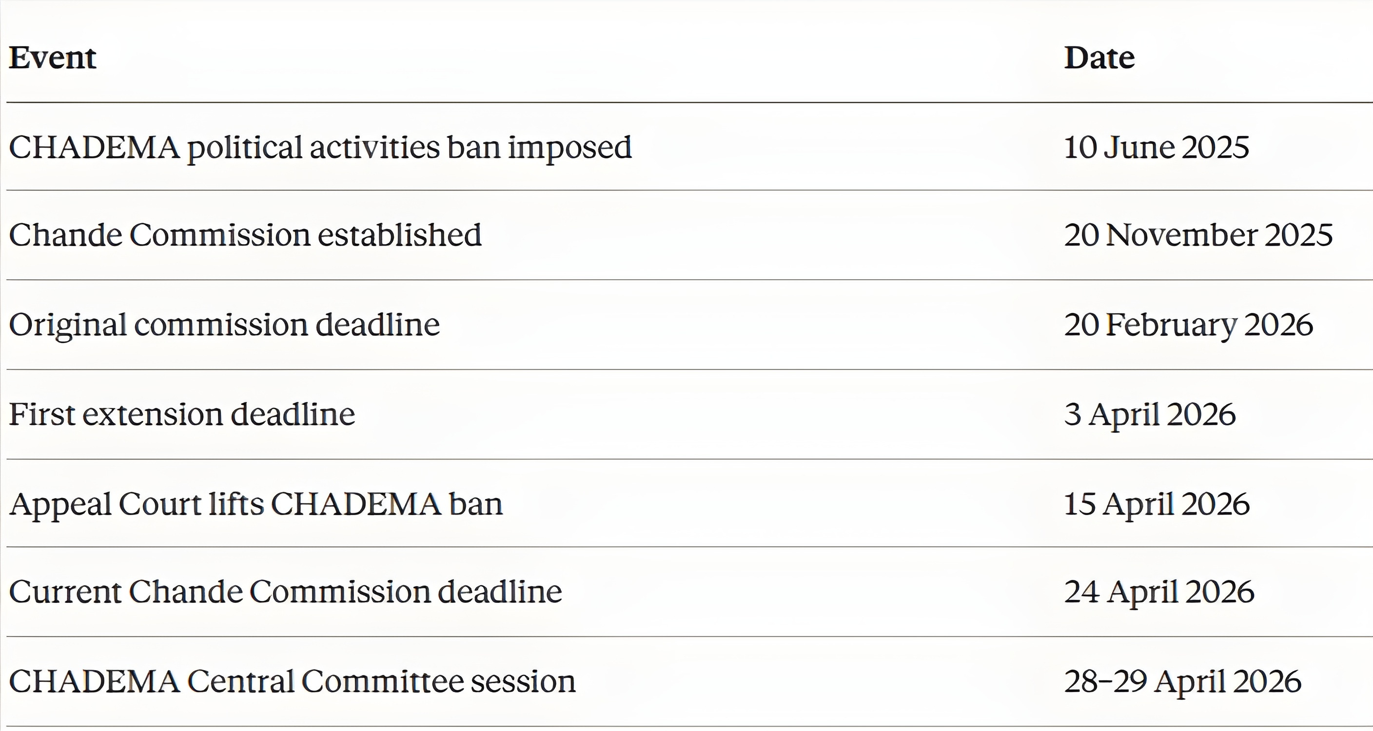 The April 24 deadline sits four days before CHADEMA’s Central Committee convenes on 28 April 2026. The gap between the report’s submission and the party’s first major internal decision-making session since the ban was imposed is analytically precise: narrow enough to ensure the commission’s findings land before CHADEMA can collectively formulate a response strategy.
