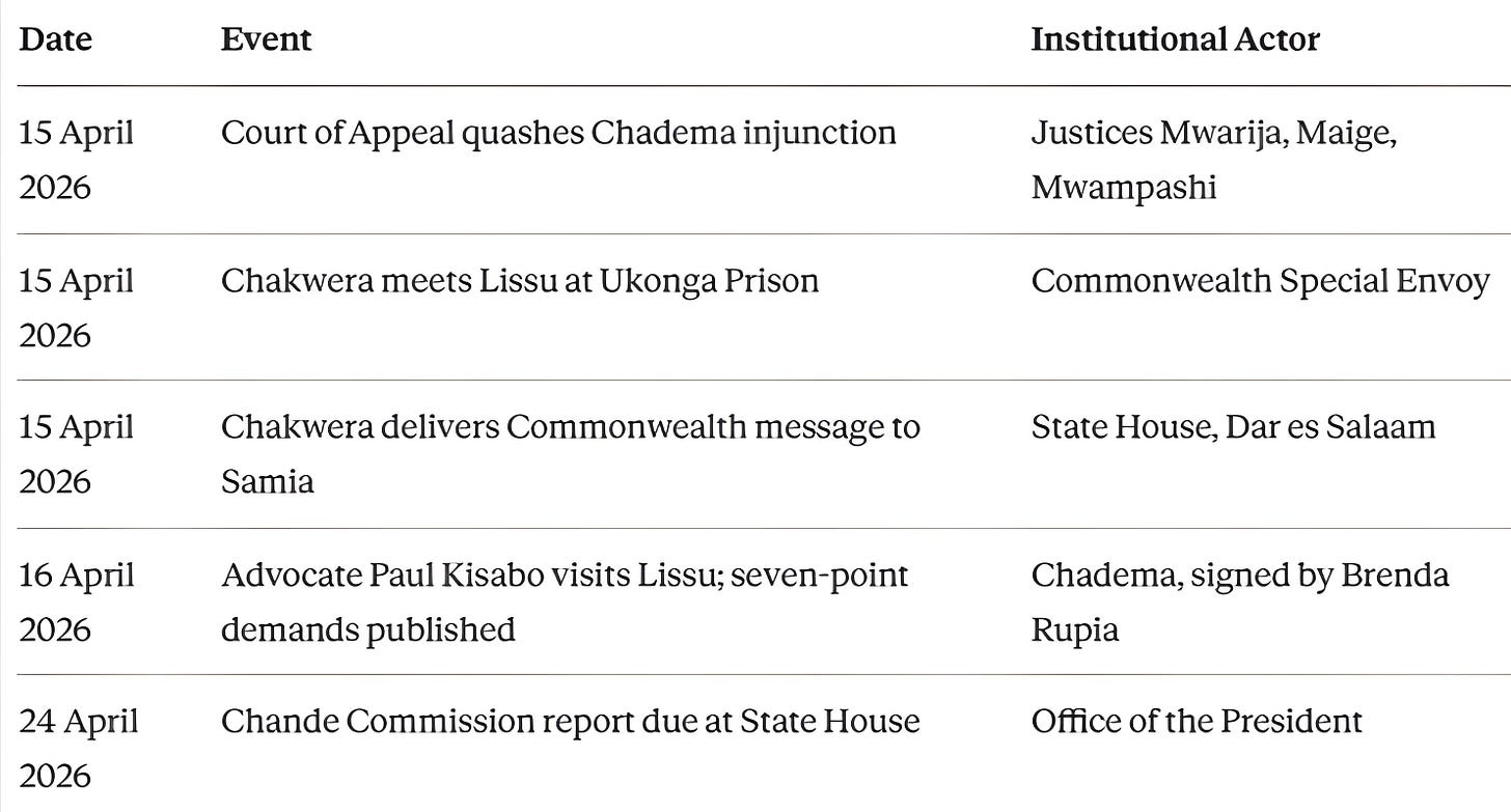 Three events occurred in rapid succession. On 15 April 2026, a three-judge Court of Appeal panel, comprising Justices Augustine Mwarija, Issa Maige, and Abraham Mwampashi, quashed the High Court injunction issued by Judge Hamidu Mwanga on 10 June 2025 that had barred Chadema from conducting political activities for 310 days. The same day, Chakwera was permitted to meet Lissu at Ukonga, a meeting confirmed in writing by Chadema’s Communications Director Brenda Rupia on 16 April 2026. Later that day, Chakwera delivered a message from Commonwealth Secretary-General Shirley Ayorkor Botchwey to President Samia Suluhu Hassan at State House.