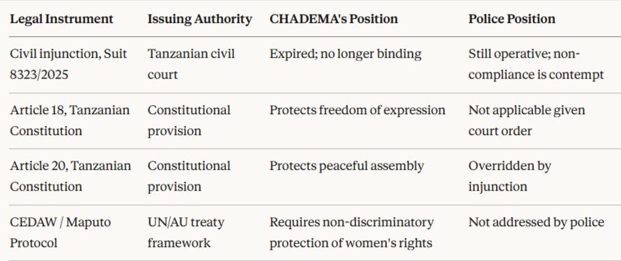 Civil suit 8323 of 2025 is being deployed as a political weapon, not a legal instrument. CHADEMA’s legal strategy must prioritise obtaining a definitive judicial ruling on whether that injunction has expired, and if courts refuse to provide one, that refusal itself becomes a documented denial of access to justice, submissible to international treaty bodies. The party should also pursue a constitutional challenge to the application of a civil injunction to prohibit participation in a United Nations-recognised international observance. Even if the challenge fails in Tanzanian courts, the proceedings generate a formal record and international visibility.