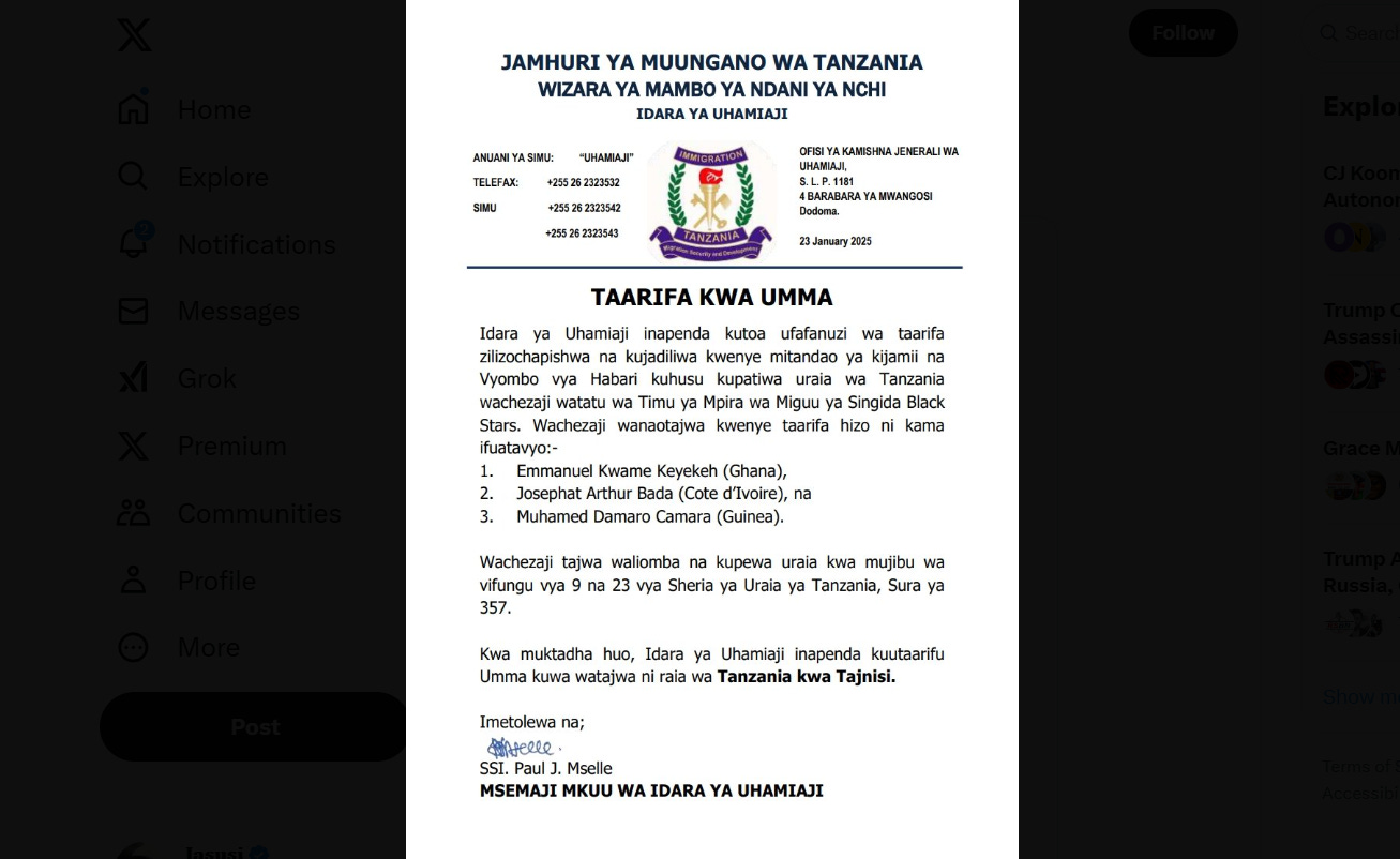 The decision by the Tanzanian Immigration Department to grant citizenship to three foreign players—Emmanuel Kwame Keyekeh (Ghana), Joseph Arthur Bada (Côte d'Ivoire), and Muhamed Damaro Camara (Guinea)—has raised public debate in Tanzania. While this move might be interpreted as a strategy to strengthen the football sector, it is essential to evaluate this decision through the lens of national security and intelligence. Foreign nationals, particularly in sensitive sectors or roles that facilitate integration into local communities, can be used as vehicles for espionage and subversive activities. Below is a detailed explanation of why this development could be a matter of intelligence concern.