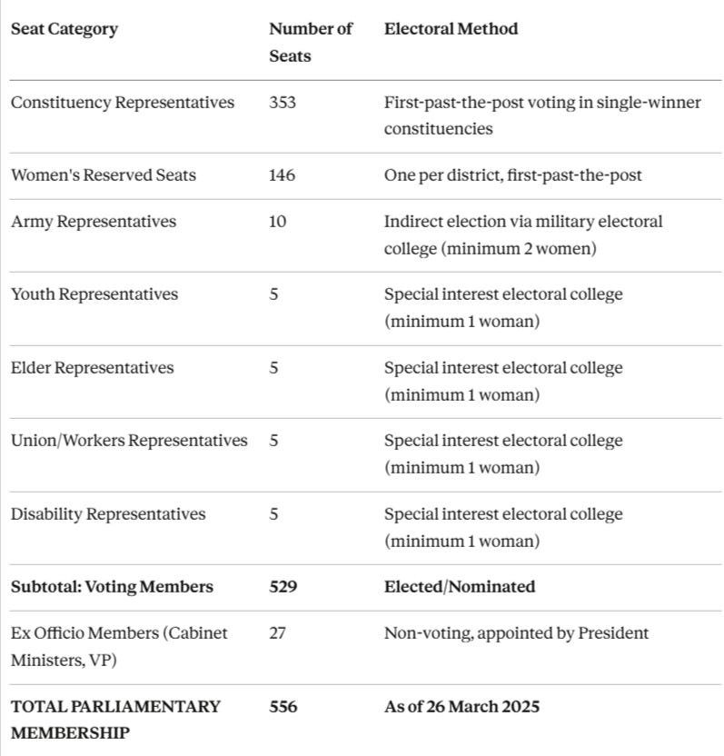 Clarification: Uganda’s parliament has 529 voting members who participate in legislation, plus 27 ex officio members (cabinet ministers and the Vice President) who attend proceedings but do not vote, bringing the total membership to 556. Opposition parties collectively control approximately 100 seats out of 529 voting seats (18.9%), representing marginal legislative influence despite significant public support in urban centres.