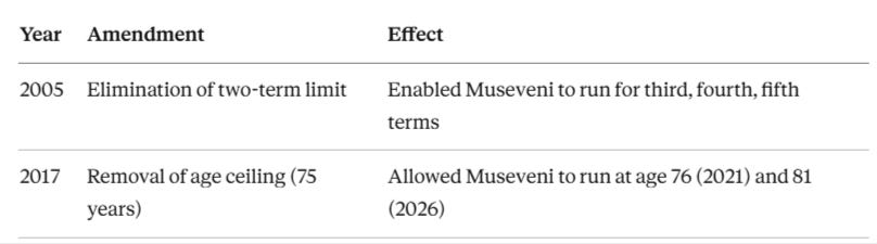 Uganda’s electoral model (term limit removal, military involvement, opposition suppression) creates template replicated across region