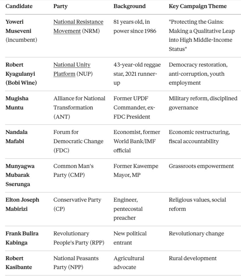 Presidential Candidates: 8 confirmed (Museveni, Bobi Wine, 6 others)