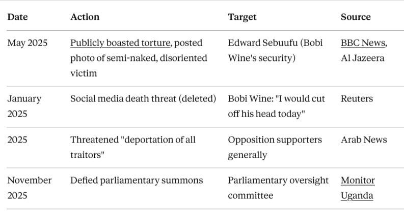 Edward Sebuufu (Bobi Wine’s bodyguard) publicly tortured - General Muhoozi Kainerugaba boasted of personally torturing him in May 2025 social media post, stating “He is in my basement. Learning Runyankore... Using him as a punching bag”