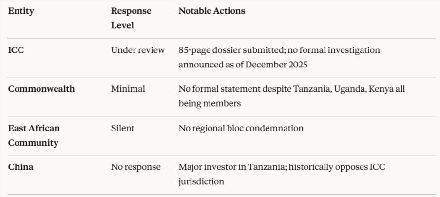 The international response to Tanzania’s post-election violence has been unprecedented in its breadth and condemnation, though critics argue it remains insufficient given the scale of atrocities.
