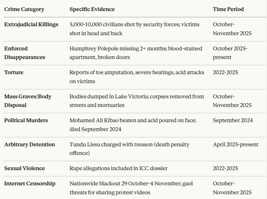 President Hassan faces allegations spanning multiple categories of crimes against humanity as defined under the Rome Statute of the International Criminal Court. An 85-page dossier presented by activists and lawyers to the ICC outlines systematic violations beginning in 2022, escalating dramatically following the October 2025 election.