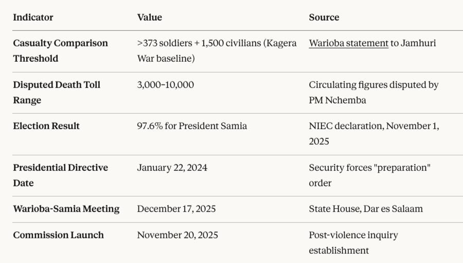 Former Tanzanian Prime Minister Joseph Sinde Warioba publicly challenged the governmentâs characterisation of October 29, 2025 post-election violence, arguing security forces used disproportionate force resulting in casualties exceeding the 1978-79 Kagera War. Speaking to Jamhuri newspaper after meeting President Samia Suluhu Hassan, Warioba questioned security preparedness, demanded casualty disclosure, and warned of dangerous political divisions within law enforcement.